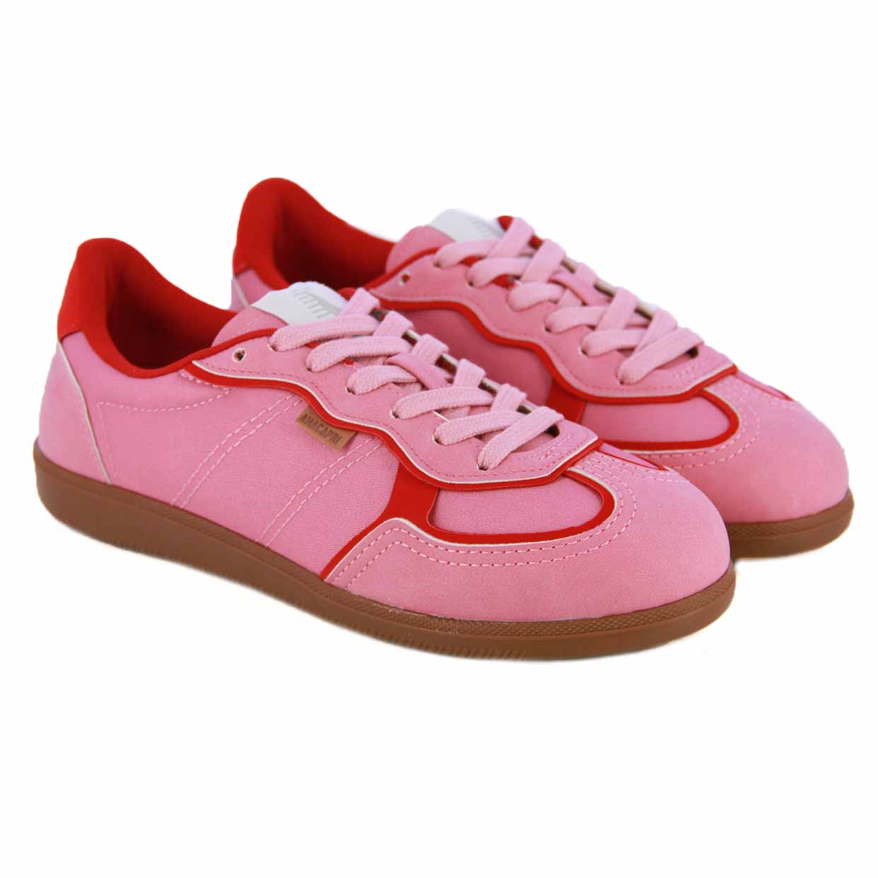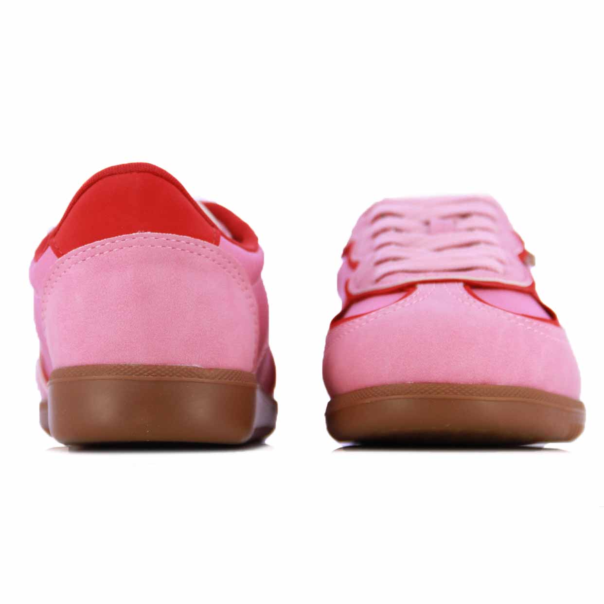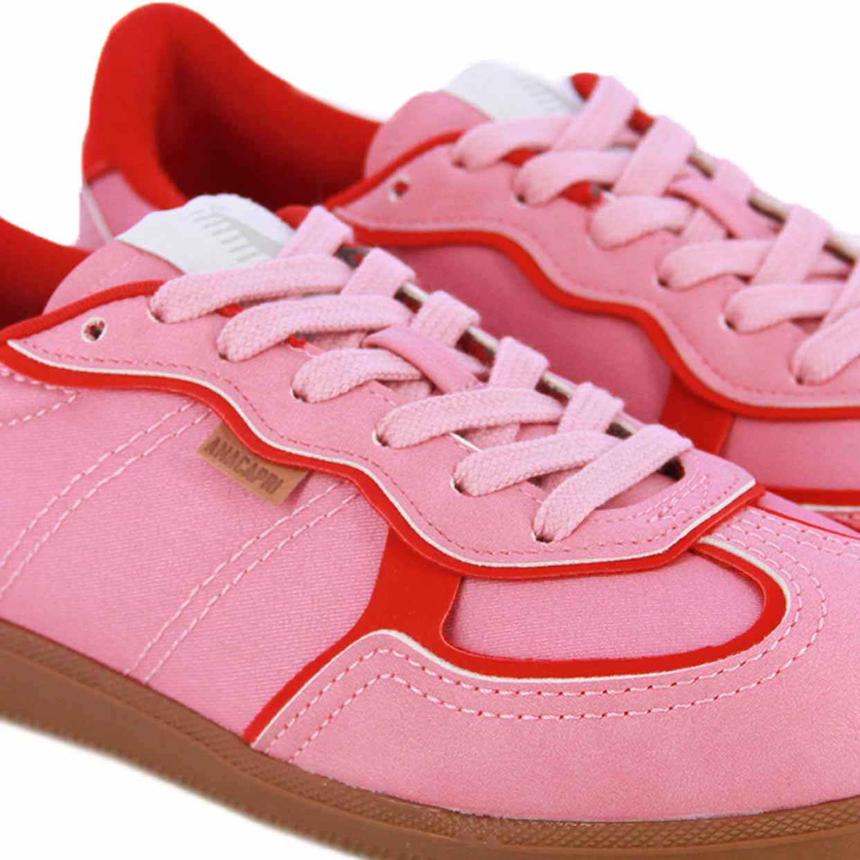A’25 Pink and Red Sneakers. With a low rubber sole in vulcanized nude gum, the model features an upper with a mix of materials: nylon fabric and suede. It brings novelty in construction – imposing topstitching detail on the sides and contours, with a design of modern and wavy cutouts with contrasting red pieces, applied to the toecap, back and tongue. Tie up, with pink laces, it has an internal part lined in red. With brown Anacapri side tag. The sneaker features the new Anacapri woven label applied to the tongue: white, with a modern and urban design, the A’25 model – the name that bears the year of launch.
