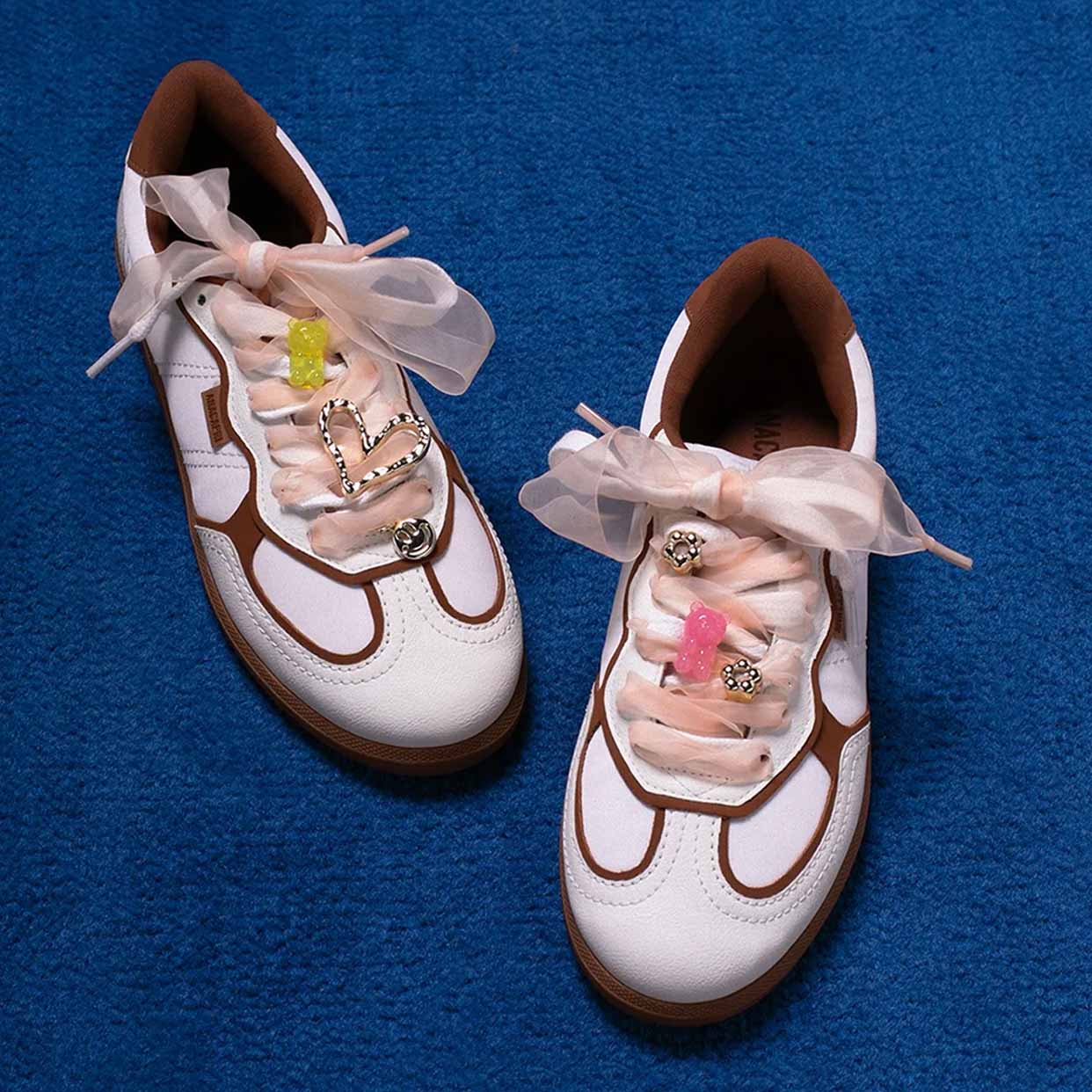 Anacapri customizable kit, in peach. The kit was designed to customize the style of your sneakers. It contains a voile fabric shoelace with transparency and a set of six metallic pendants in various sizes, with designs of hearts, flowers, pearls, and teddy bears. The kit is sold separately from the sneakers.