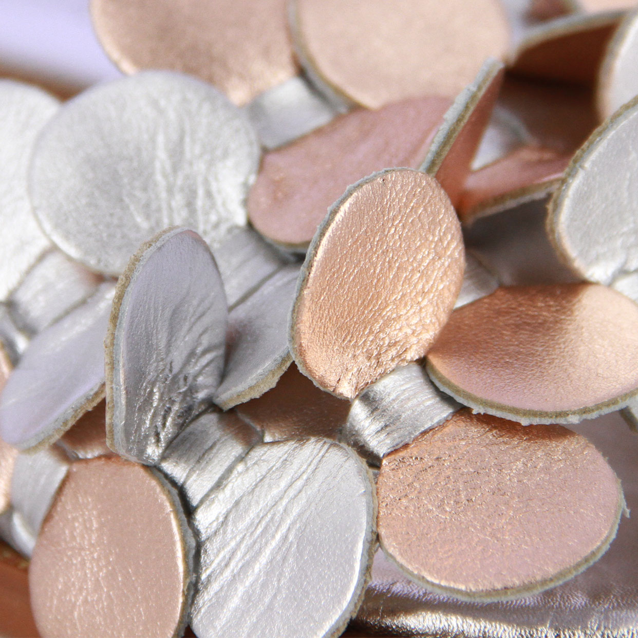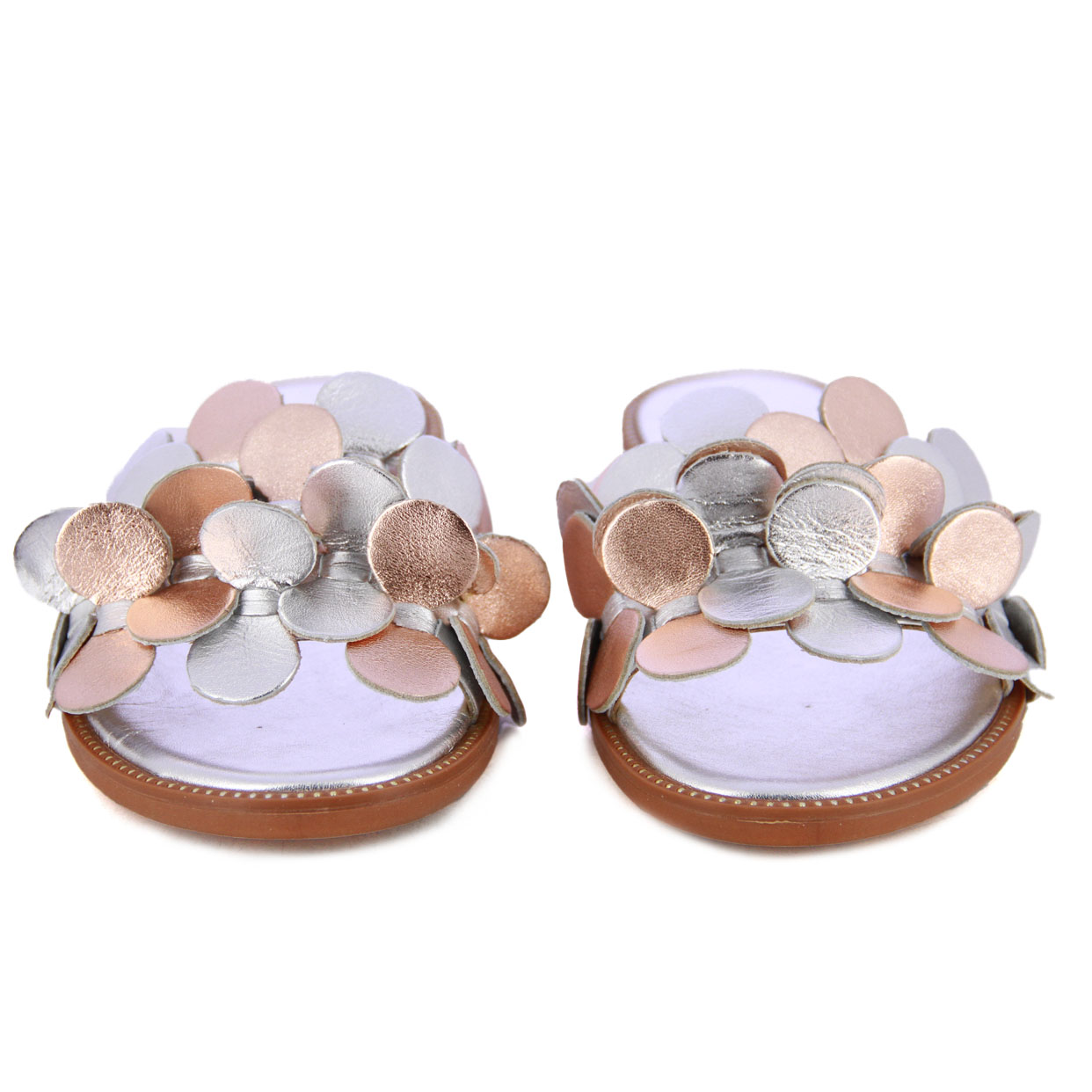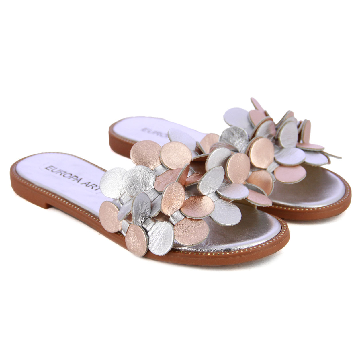 Elevate any summer ensemble to new heights of elegance with the Detailed Leather Slip-On Sandal in silver and rose metal from Europa Art. Crafted with meticulous attention to detail, these sandals are a true embodiment of luxury and style. Constructed with premium leather upper material and boasting a leather sole, they offer exceptional quality and unparalleled comfort with every step. Adorned with delicate leather cut-out petals, they exude a sense of femininity and charm while the flat design ensures effortless wearability.