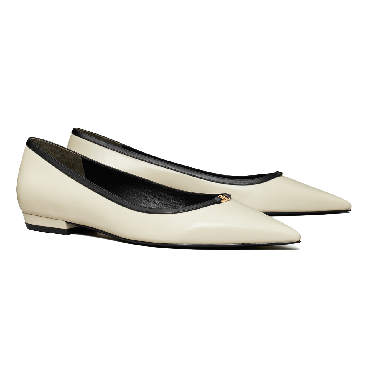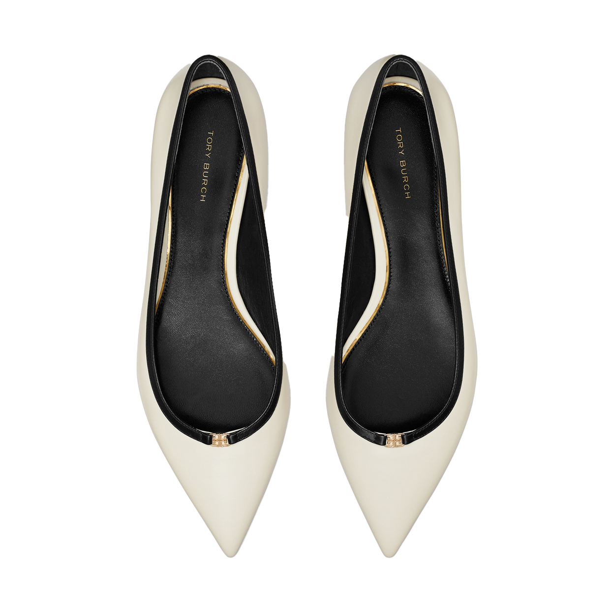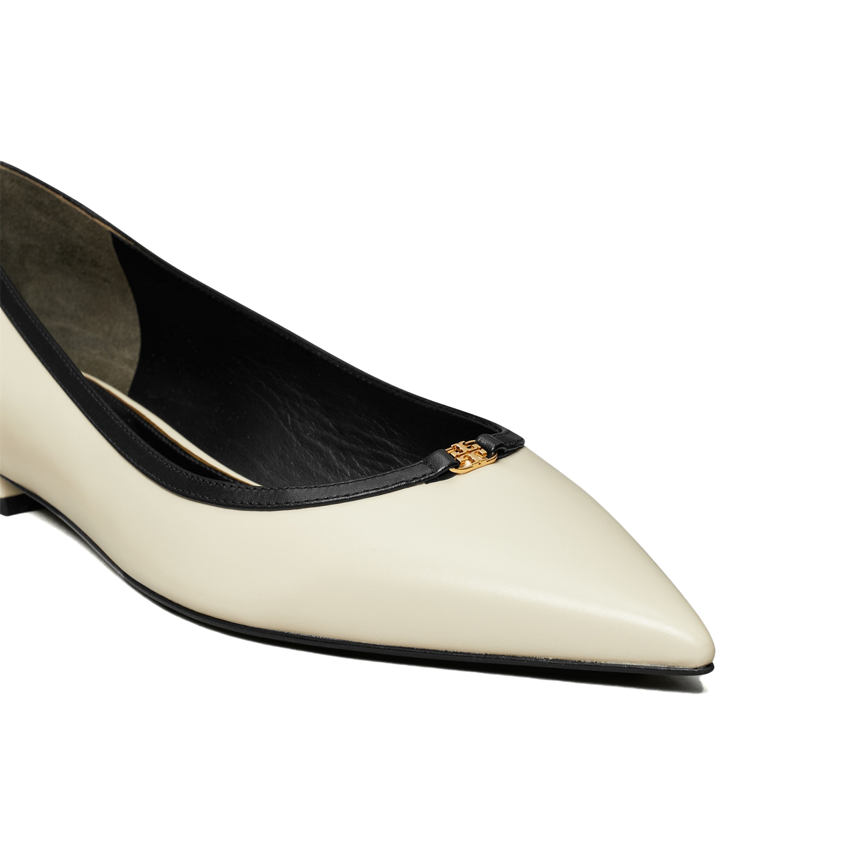 Minimal and timeless, the pointed-toe flat features a discreet Double T front buckle detail. A slight heel adds subtle lift.