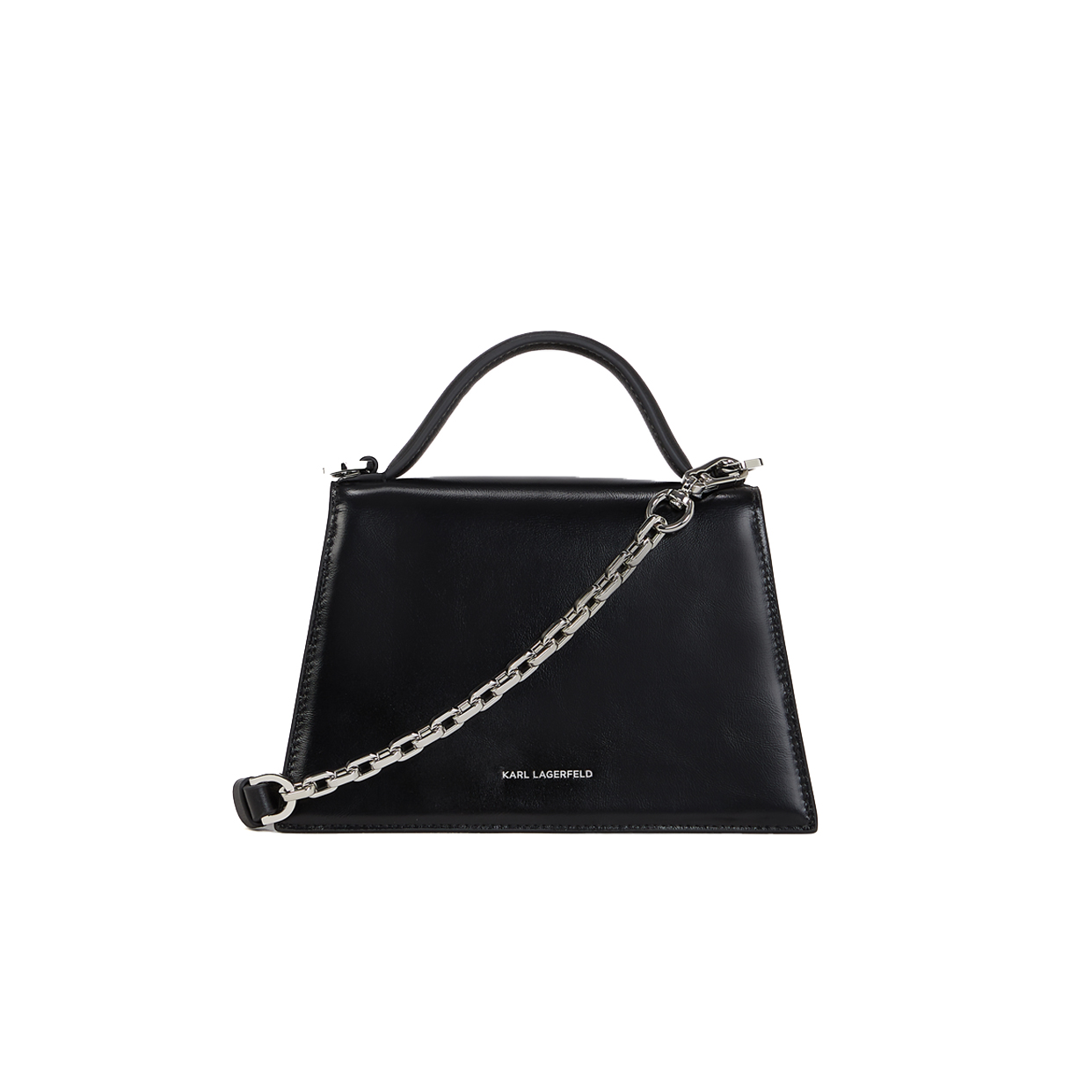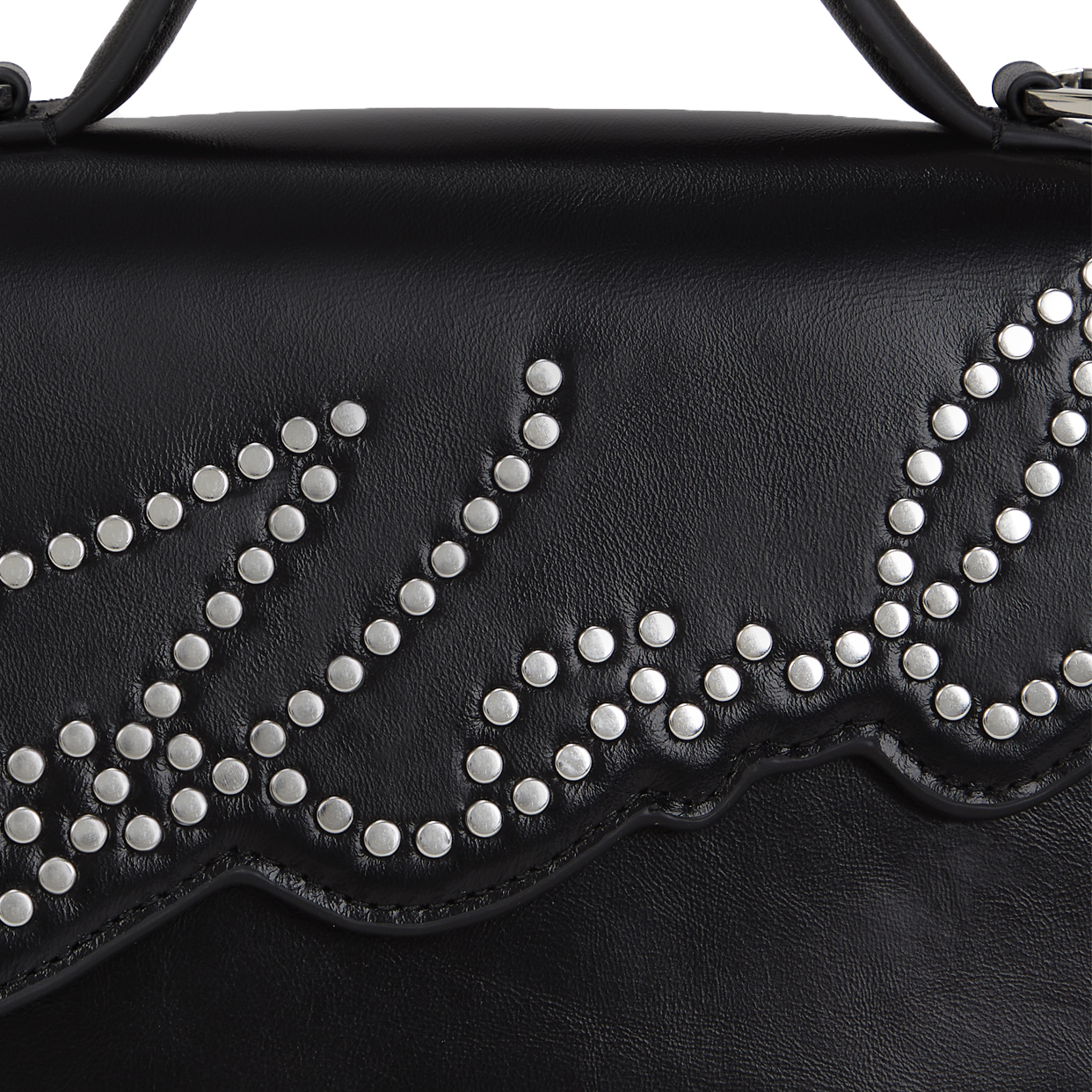 Add rock chic vibes to any outfit with this studded crossbody bag. Featuring a magnetic pin flap closure, it offers easy access while the edgy chain detailing adds a bold touch. The statement Karl Signature logo enhances its unique character, complemented by a small top handle and a detachable strap for multiple styling options.