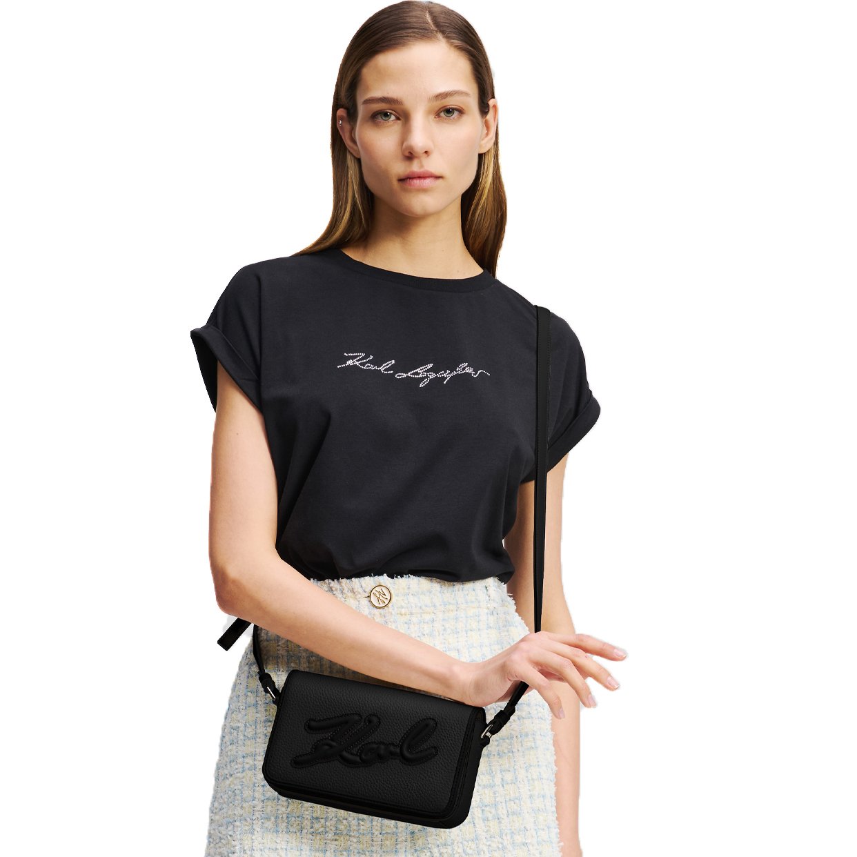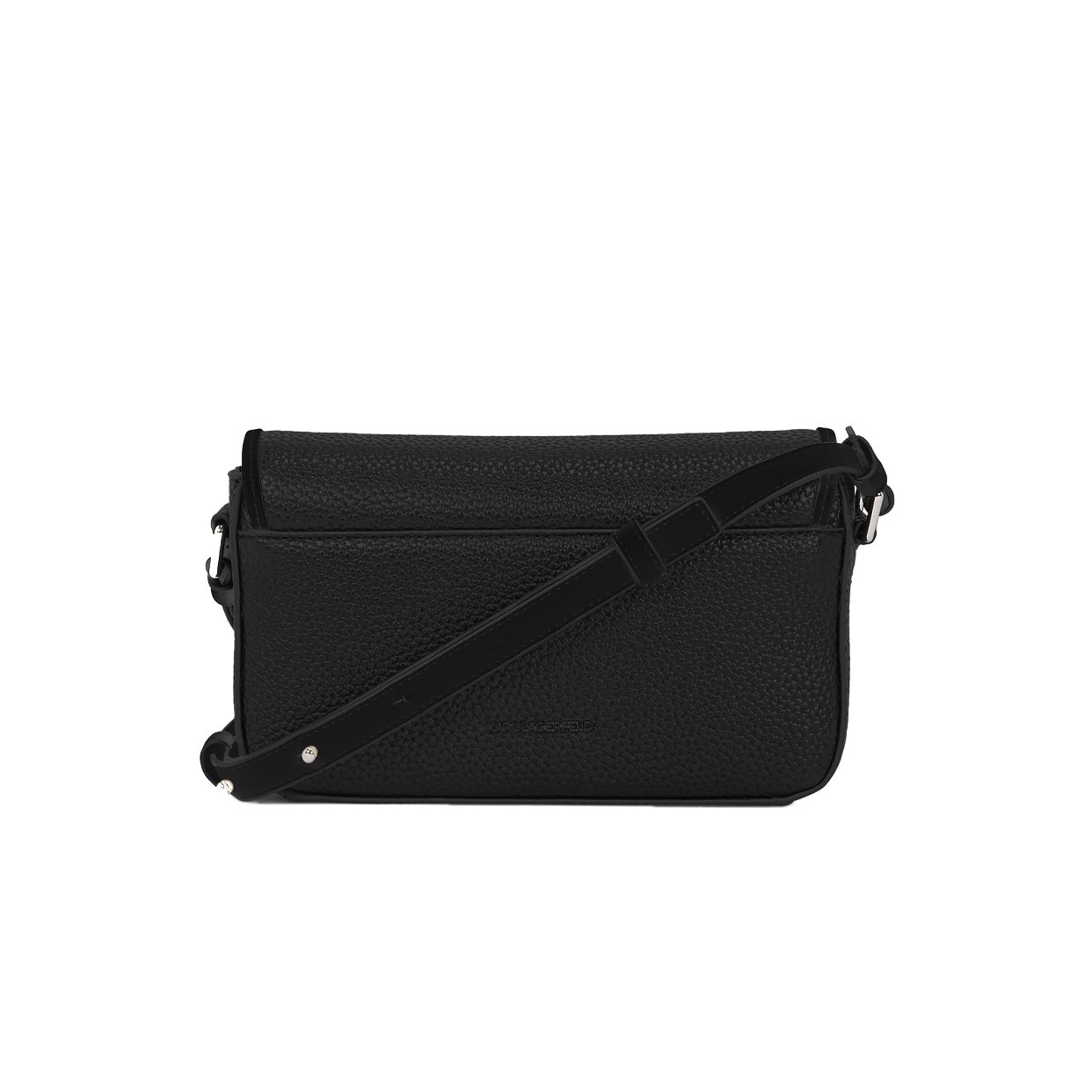 This statement crossbody bag combines modern design with practicality. A magnetic flap closure ensures essentials remain secure, while the adjustable strap offers personalized styling. The embossed Karl Signature logo adds a touch of elegance to this versatile piece.
