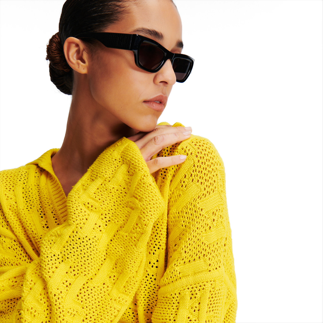 Crafted for the quintessence of chic, these sunglasses boast a rectangular silhouette with dark lenses, crystal-embellished temples, and the signature monogram.