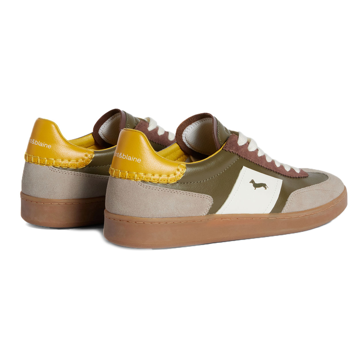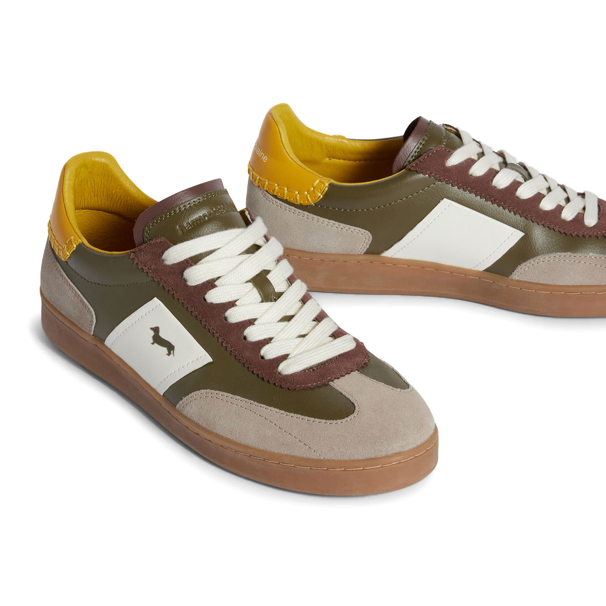 Men’s shoe with a contemporary style, highlighted by a high-frequency heat-sealed rubber dachshund logo on the side band and an embossed script logo on the heel. The crochet stitching detail on the heel tab enriches the design. The upper combines suede and soft calf leather with visible stitching and flat laces. The technical fabric footbed ensures comfort, while the amber rubber sole and Strobel construction guarantee flexibility and durability.