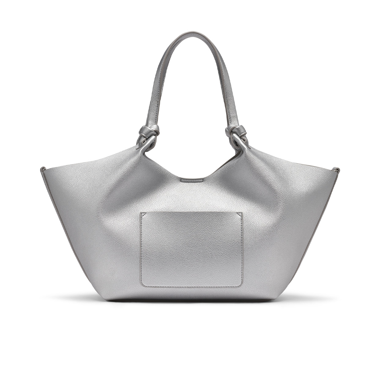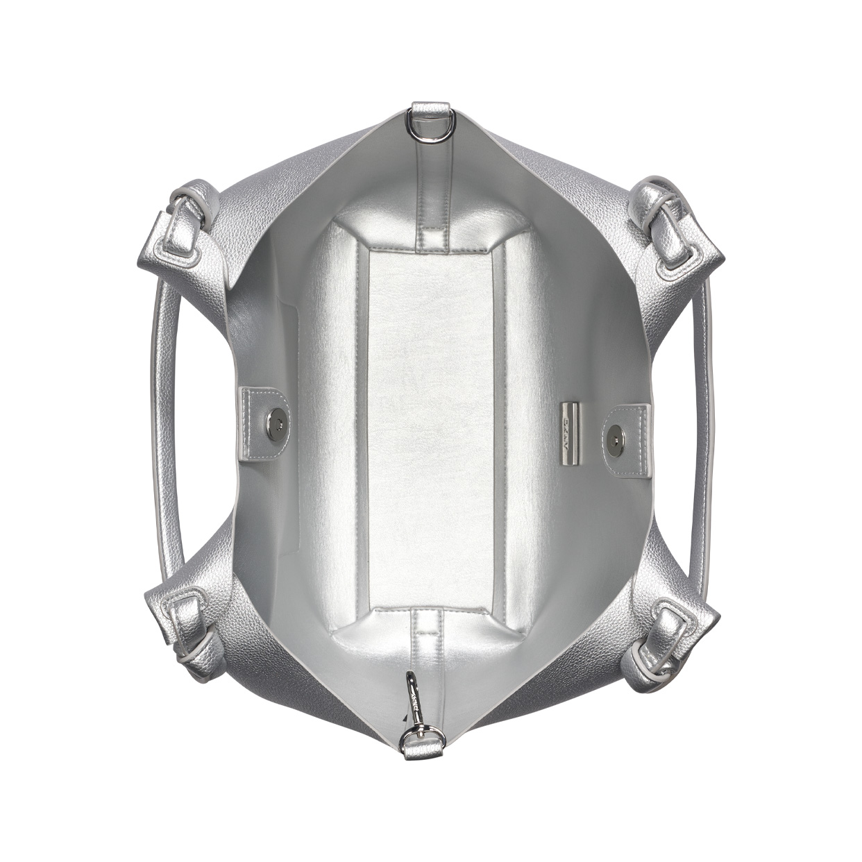 - Exterior back slip pocket; detachable pouch; dual top-knot handles; magnetic snap tab fastening