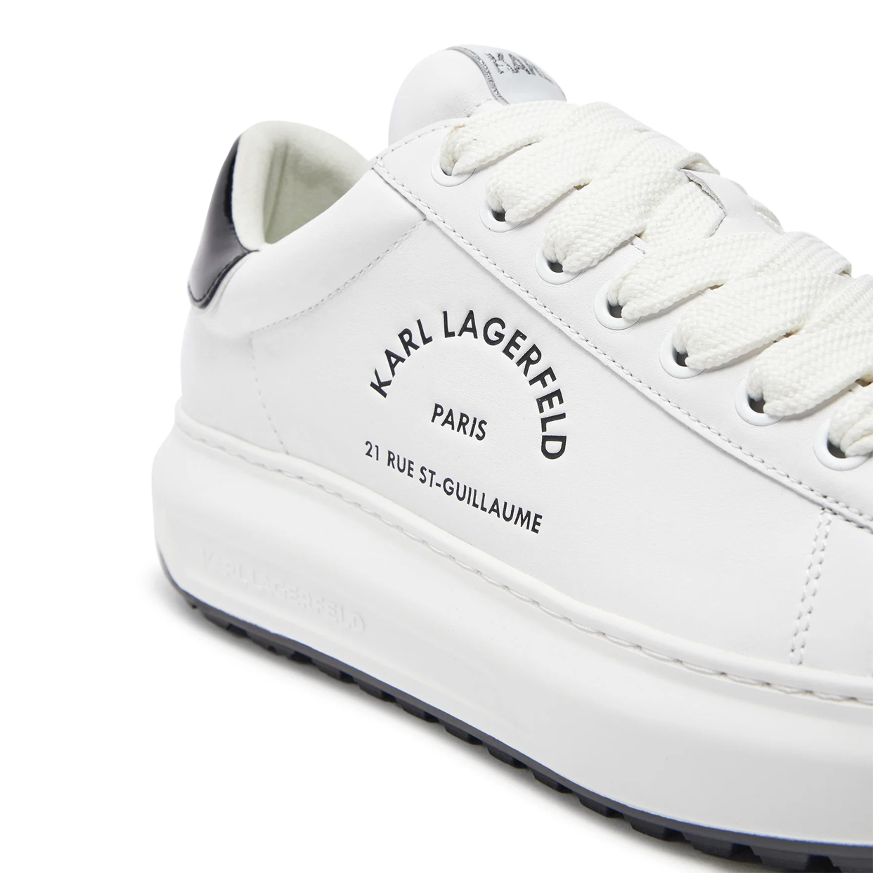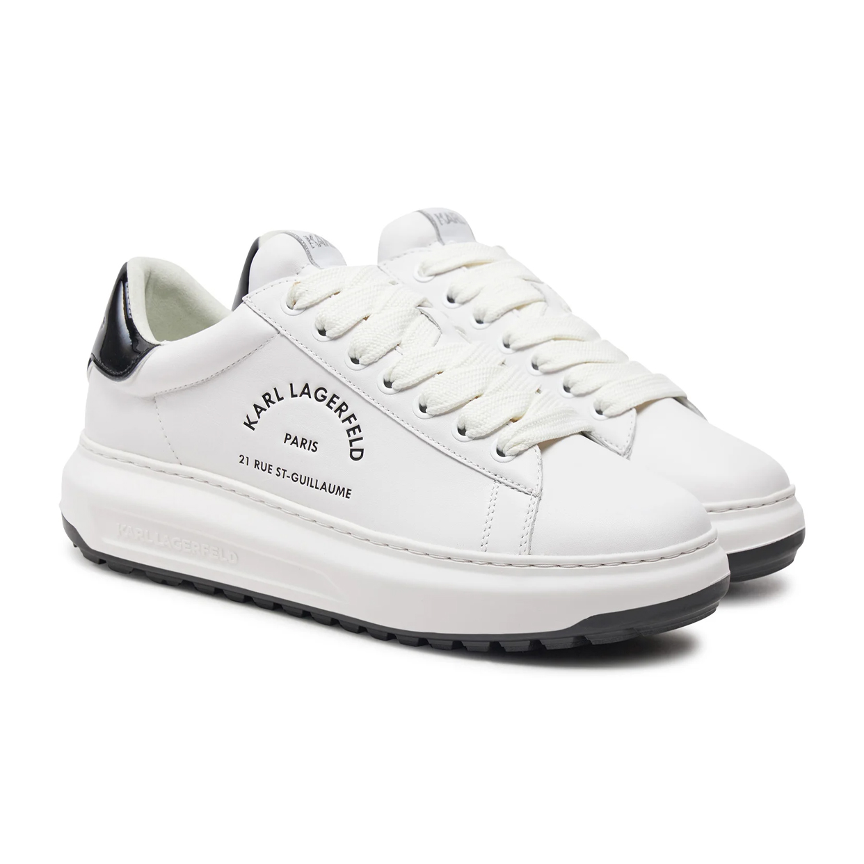 Elevate your style effortlessly with these luxurious KARL LAGERFELD sneakers, embellished with the iconic Rue St-Guillaume logo. Crafted from premium leather, these sneakers feature a sleek lace-up design and a striking contrasting heel counter.